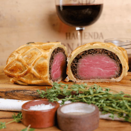 Sous-vided Beef Tenderloin wrapped in mushroom duxelle and real butter puff pastry.